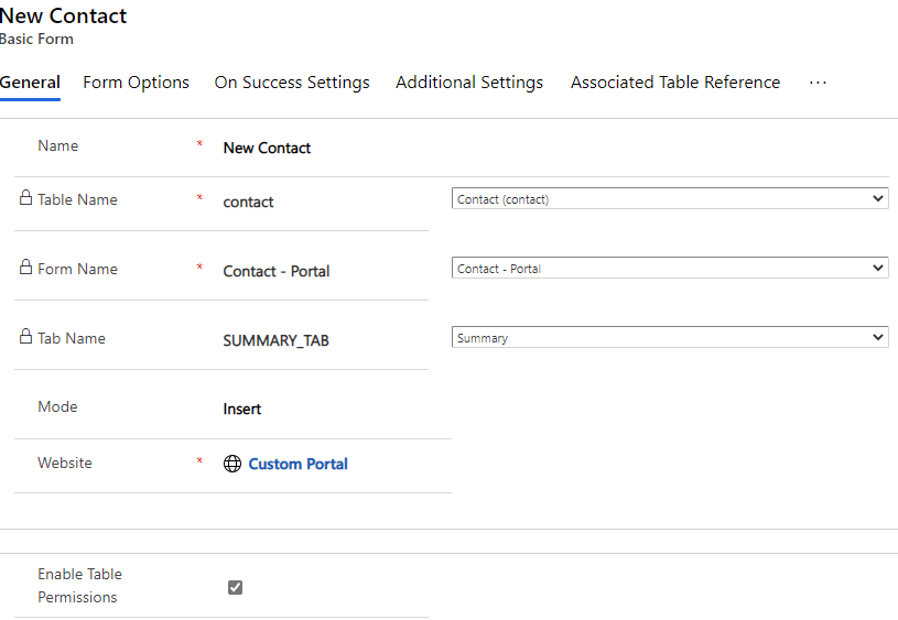 - Step 6: Create a Web Page either by using the new Portal Studio with the steps mentioned here or use the traditional way by following the steps mentioned here. If you are using Portal Studio then use these steps to associate Basic Form to the web page or else just update the Basic Form lookup on web page record while following the steps mentioned here, use the basic form created in step 3. In this example, I created a web page called “New Contact”