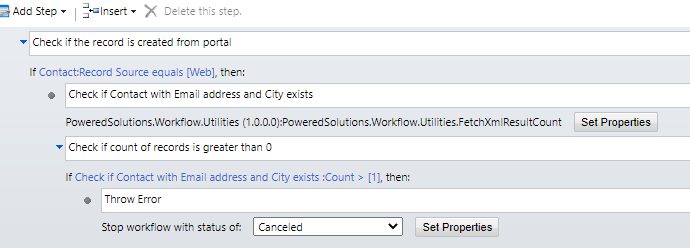 - If #3 is true then this step will cancel the execution of the workflow by throwing the error “Contact already exists“. This will roll back the entire transaction and a new contact is not created in Dataverse..