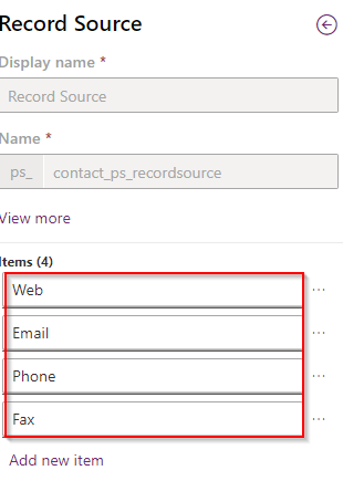 - Step 2: Add new field called “Record Source” to contact entity of type option sets with following options: